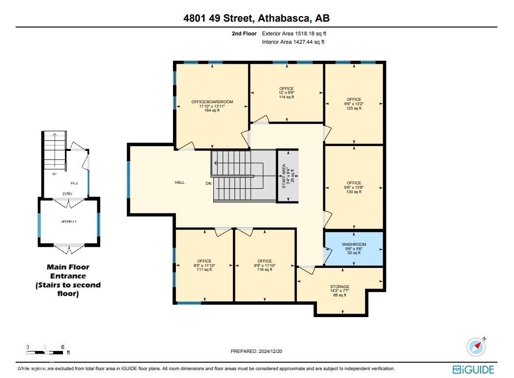 FOR LEASE - 1427 sq ft of desirable office space located on the 2nd floor in the downtown region of Athabasca, AB. Space consists of 6 offices, 1 bathroom, storage room & open coffee station/staff area on 2nd floor. All offices are of good size; ranging from 111 sq ft to 164 sq ft in size. One of the offices could easily be used as the boardroom as it has 2 entrances, allowing easy access to all. 12 month lease for entire space desired; however landlord willing to rent out individual offices as well. Lease rate of $2100/month for entire area ($12/sqft net + $6/sqft operating = $18). Lease includes all utilities (power, heat, water, sewer, electrical and security system). Tenant would be responsible for garbage, recycle and shared cost of lawn maintenance/snow removal.
